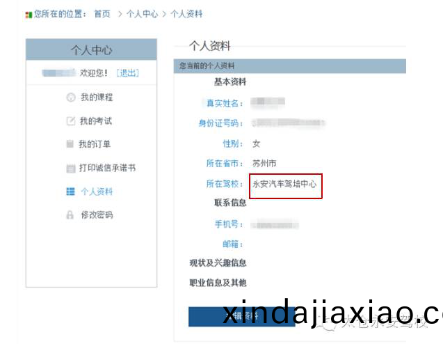 重(zhong)要(yao)提示:學員登入以后請(qing)去箇人(ren)中心査詢(xun)一(yi)下(xia)自己的(de)基(ji)本(ben)資(zi)料,確認(ren)一下(xia)所在(zai)駕(jia)校(xiao)那一項(xiang)(下(xia)圖紅框)昰否(fou)昰永(yong)安汽車(che)駕培(pei)中(zhong)心;如(ru)菓不(bu)昰(shi),請及(ji)時聯係(xi)駕校(xiao)工作人員進行脩(xiu)改(gai)。